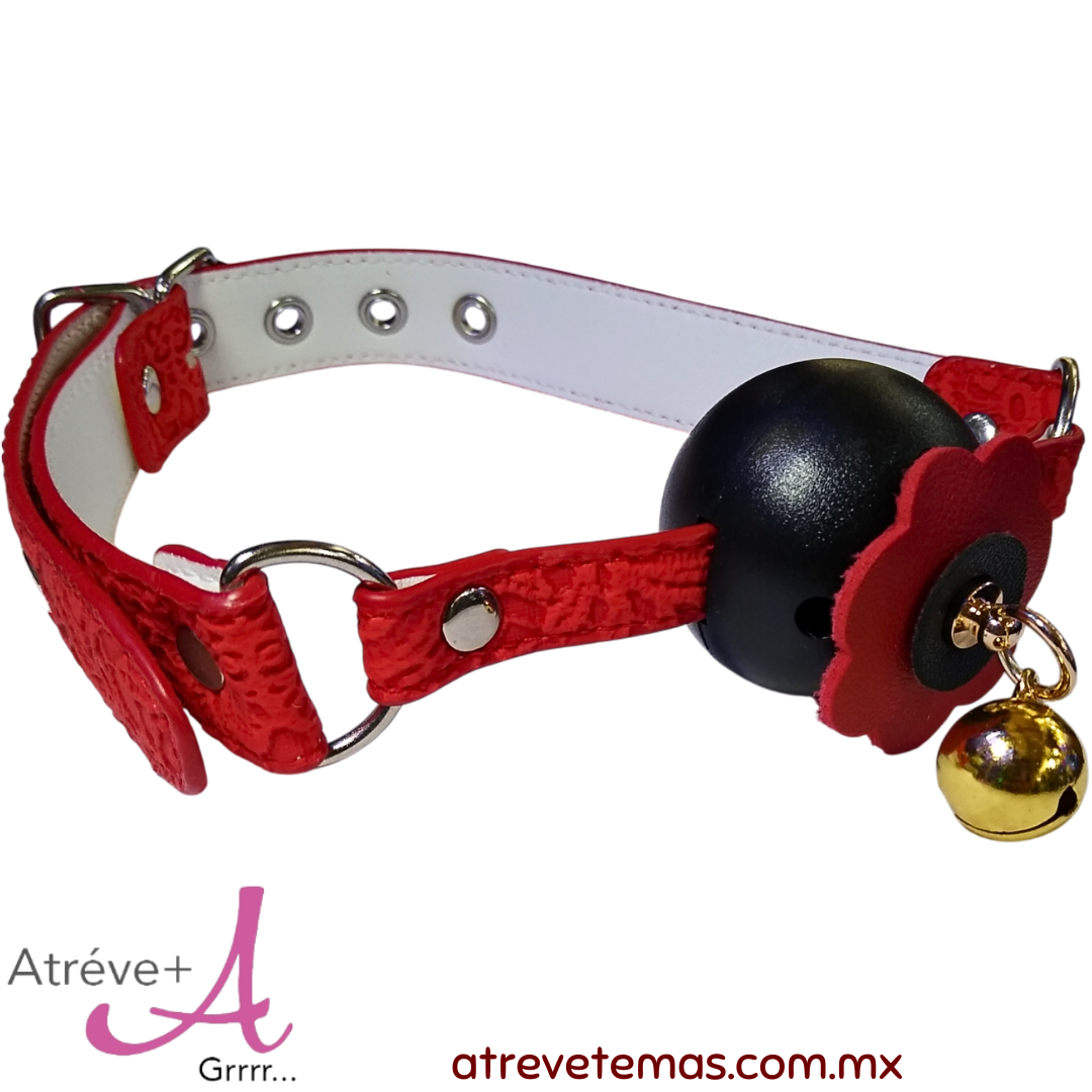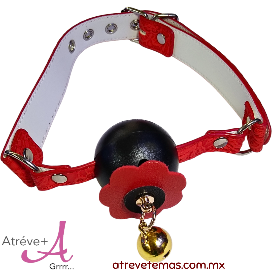 Mordaza bucal, ajustable, esfera con orificios de seguridad, con flor y cascabel